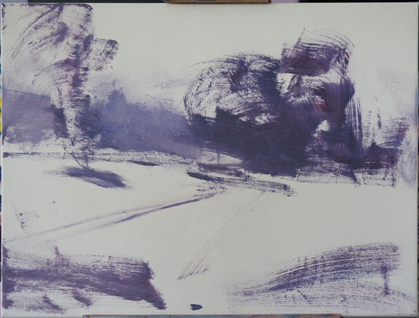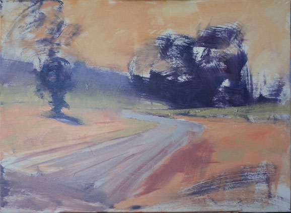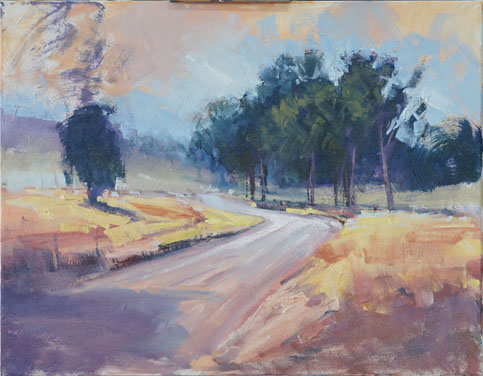 The distant grass and road colours were laid in as well as the dark gravel beside the road in the foreground. Red-violet is used to tame down the green. Make sure the brush strokes don't go all the same way.